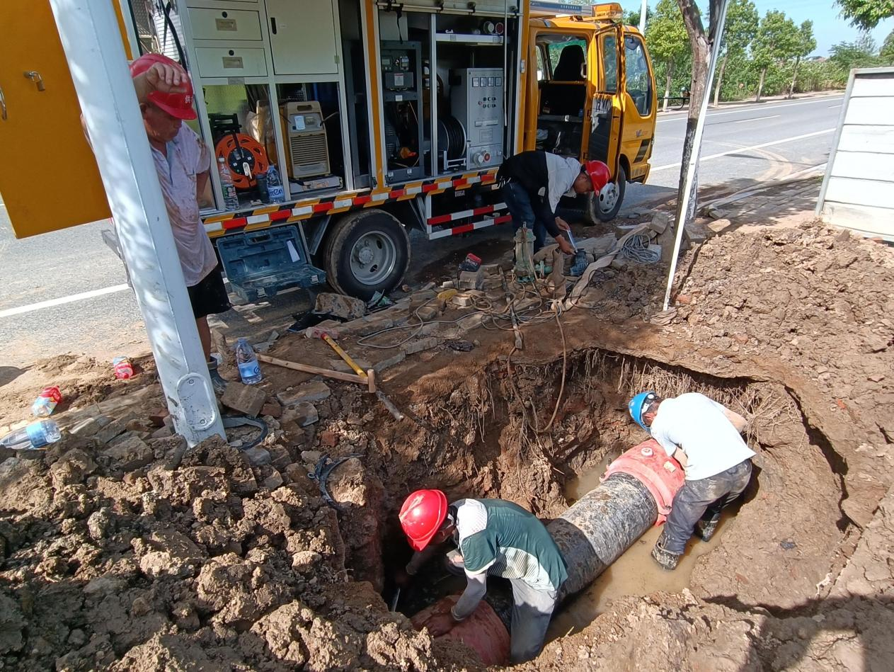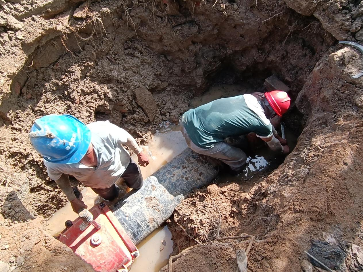 正值三伏天,天氣炎熱,氣溫高達40度。搶修人員絲毫不懼酷熱,他們在做好高溫防護后輪番上陣,有序推進(jìn)搶修工作。經(jīng)過(guò)挖掘、清理,作業(yè)坑成型,破損的DN400管道露出水面。隨后,搶修工作緊鑼密鼓展開(kāi)。經(jīng)過(guò)近8小時(shí)的奮戰,于當天下午4點(diǎn)完成了搶修任務(wù),從最大程度上減少了對附近居民及工商業(yè)用水造成的影響。