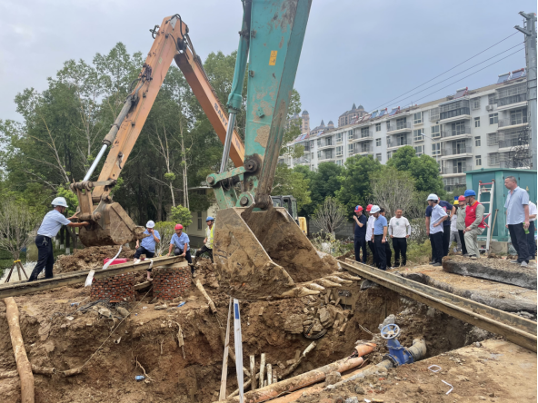 17日清晨開(kāi)始,50余名各方人員和10余臺工程機械設備繼續增援、先后到場(chǎng),現場(chǎng)邊排水邊開(kāi)挖,并按照多套搶修方案分頭準備。
