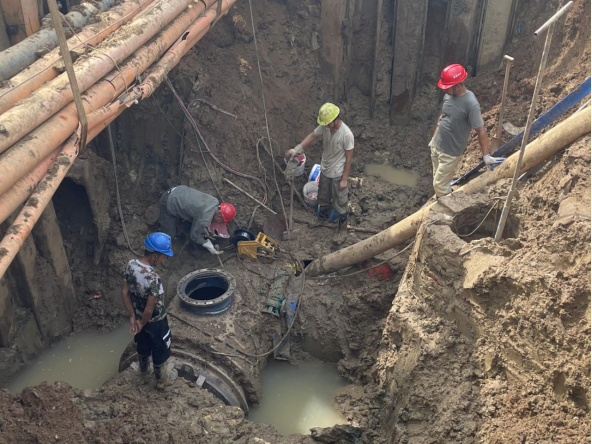 晚上9點(diǎn),公司第一時(shí)間派出10余名搶修人員迅速到場(chǎng)關(guān)閘止水,三水廠(chǎng)暫停供水。與此同時(shí),技術(shù)人員、施工人員和設備設施“跑步前進(jìn)”、同步到場(chǎng),對破損溢水點(diǎn)進(jìn)行邊開(kāi)挖、邊診斷。由于情況復雜,晚上24點(diǎn),3臺大型挖機、樁機進(jìn)場(chǎng),20余人到場(chǎng)增援,清理作業(yè)面。市政府組織市住建局、澴川國投、供電公司、燃氣公司即刻組成技術(shù)專(zhuān)班,會(huì )同公司技術(shù)人員和一線(xiàn)工人現場(chǎng)制定搶修方案。