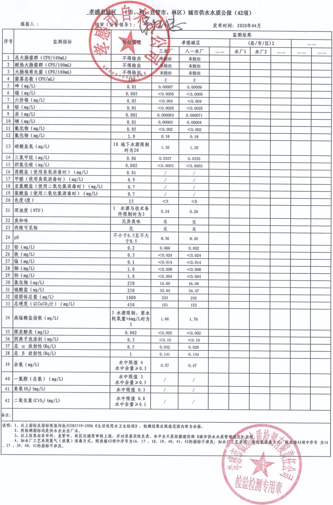 2020年4月水質(zhì)報告