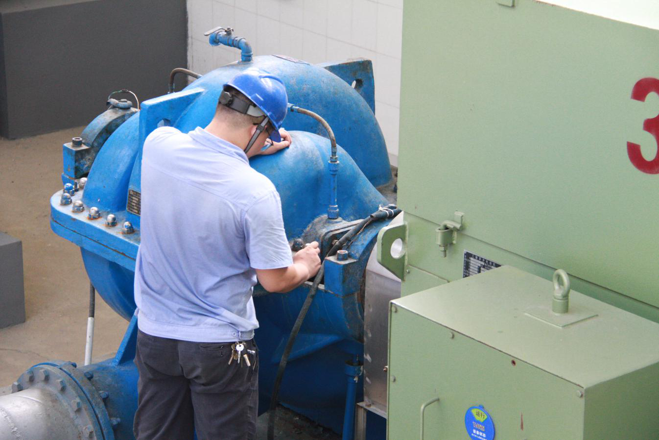 檢測結束后,維修人員又來(lái)到了送水泵房,40多度的廠(chǎng)區內,3個(gè)大水泵發(fā)出巨大的聲音,給原本密閉的廠(chǎng)房又增添了一絲燥熱。送水泵房是供水系統的最后一步,承擔著(zhù)輸送孝感城區和周邊鄉鎮以及云夢(mèng)城區和周邊鄉鎮80多萬(wàn)居民生活用水的重任,水泵一旦出現問(wèn)題,就會(huì )影響居民的正常用水。為了保證用戶(hù)的用水安全,維修人員每天都會(huì )對送水機組進(jìn)行檢查和維護。通過(guò)用手摸、用眼看、用耳聽(tīng),檢查送水機組的運行狀態(tài),確定下一步的維護方案。