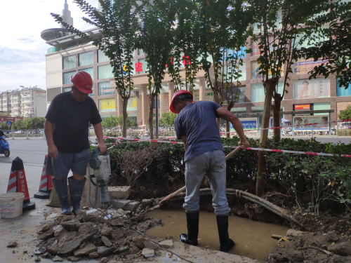 9月9日,我們跟隨搶修車(chē)輛來(lái)到了今天的第一站:乾坤商務(wù)酒店門(mén)口,由于管道漏水,現場(chǎng)不斷有水從地底滲出,加上地點(diǎn)特殊我們搶修工只能用鐵鍬等工具將道路破開(kāi),再找出破損位置,對管道進(jìn)行更換維護處理。