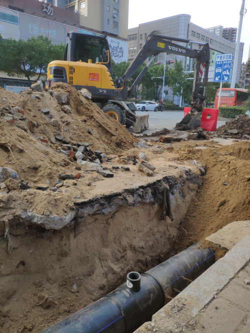 最后我們來(lái)到了槐蔭大道與北京路交接處,由于槐蔭大道全線(xiàn)施工改造,位于北京路交接處的供水管道需要向外遷移,現場(chǎng)挖掘機,熱熔機一齊開(kāi)動(dòng),各部門(mén)通力合作,密切配合,各司其職,各負其責,一節一節地推進(jìn),把工作做實(shí)做細。